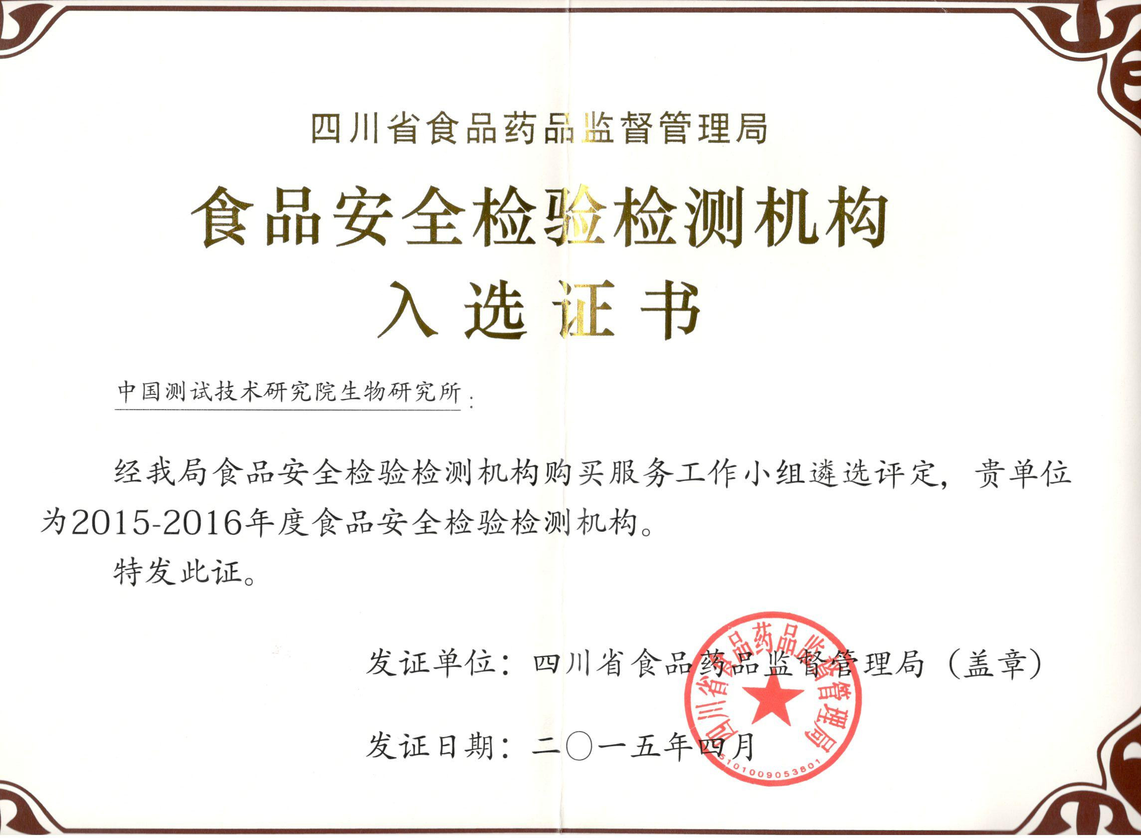 5月4日,四川省食品藥品監(jiān)督管理局正式公布了2015-2016年度四川省食品安全檢驗(yàn)檢測(cè)機(jī)構(gòu)名單(共6家),中國(guó)測(cè)試技術(shù)研究院生物研究所憑借扎實(shí)的技術(shù)實(shí)力入圍此項(xiàng)名單。該名單是四川省食品藥品監(jiān)督管理局從全省數(shù)十家相關(guān)檢測(cè)技術(shù)機(jī)構(gòu)中根據(jù)專業(yè)技術(shù)水平、業(yè)內(nèi)權(quán)威性、服務(wù)質(zhì)量和社會(huì)影響力等多種條件考核篩選后確定。入圍機(jī)構(gòu)有資格承擔(dān)2015-2016年四川省食品安全監(jiān)督抽檢任務(wù)及食品安全風(fēng)險(xiǎn)監(jiān)測(cè)任務(wù)。