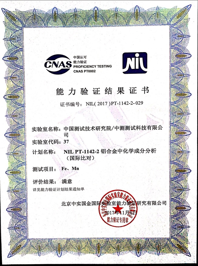 我院生物研究所于9月參加了“NIL PT-1142-2 鋁合金中化學(xué)成分分析(國(guó)際比對(duì))”能力驗(yàn)證計(jì)劃。本次能力驗(yàn)證是由北京中實(shí)國(guó)金國(guó)際實(shí)驗(yàn)室能力驗(yàn)證研究有限公司組織實(shí)施的國(guó)際比對(duì),共有72家境內(nèi)外實(shí)驗(yàn)室參加家國(guó)內(nèi)外實(shí)驗(yàn)室參加,生物所提交的兩項(xiàng)參數(shù)(鐵Fe、錳Mn)均獲得滿意結(jié)果,其中一項(xiàng)的結(jié)果為本次能力驗(yàn)證的穩(wěn)健平均值。