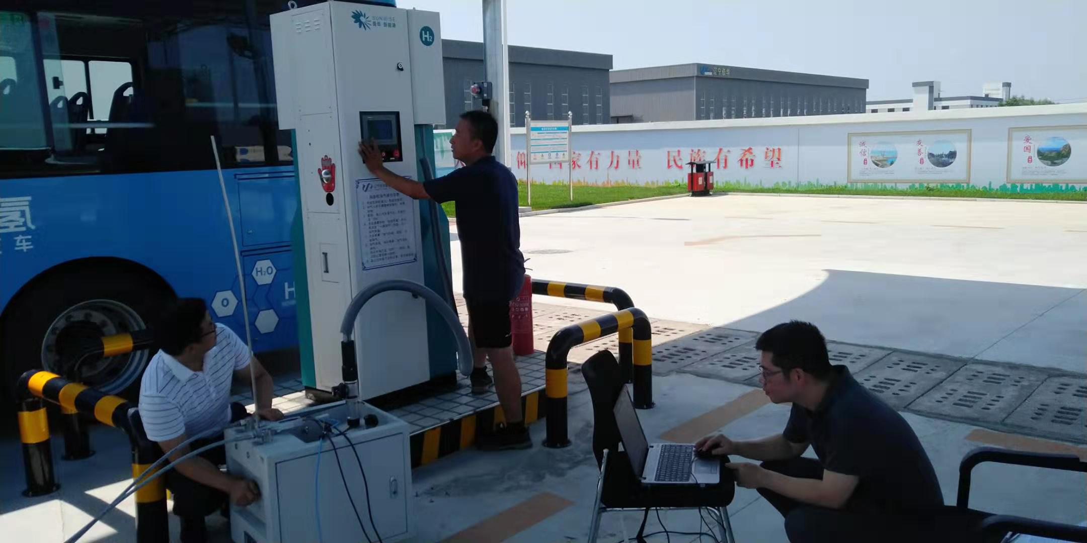 2019年7月30日至7月31日,我院流量研究所受遼寧佳華新能源有限公司委托,對低壓加氫站向首輛裝配有低壓合金儲氫系統(tǒng)的公交車進(jìn)行氫氣加注提供校準(zhǔn)服務(wù),該加氫站是全球首座低壓加氫站,坐落于遼寧省葫蘆島興城經(jīng)濟(jì)開發(fā)區(qū)。低壓合金儲氫和加注系統(tǒng)的儲氫工作壓力為5MPa、氫氣槽車儲存最高壓力為20MPa,加氫機工作壓力為20MPa,相比常規(guī)高壓(35MPa或70MPa)儲氫加氫系統(tǒng),可使氫氣運輸、儲存到加注環(huán)節(jié)的壓力降低,在備用電源、交通運輸?shù)忍囟I(lǐng)域有著較為廣泛的應(yīng)用前景。