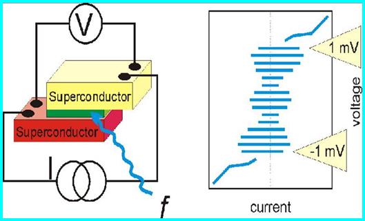 式中f為輻照在超導(dǎo)結(jié)上的微波頻率,n為微波感應(yīng)臺(tái)階數(shù),e為電子電荷,h為普朗克常數(shù),KJ=2e/h為約瑟夫森常數(shù),Vn為第n個(gè)臺(tái)階處的電壓,該關(guān)系從理論上為保存或統(tǒng)一全世界的電壓?jiǎn)挝坏於嘶A(chǔ),約瑟夫森因此榮獲了1973年的諾貝爾物理學(xué)獎(jiǎng)。